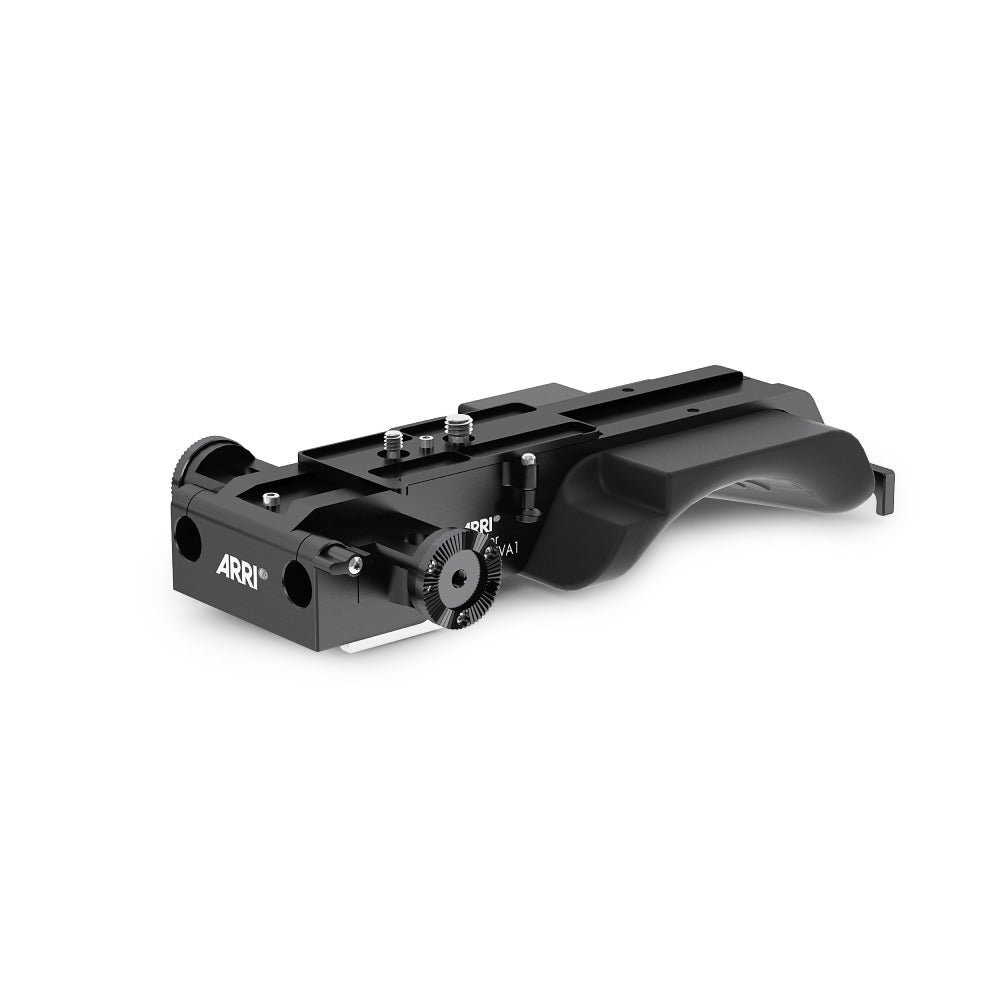 The ARRI plate for Panasonic AU-EVA1 is a hybrid support with 15mm LWS Base Plate and comfortable shoulder pad. The plate works perfectly with BP-8 or BP-9 and also with VCT-style tripod adapters such as the QRP-1.